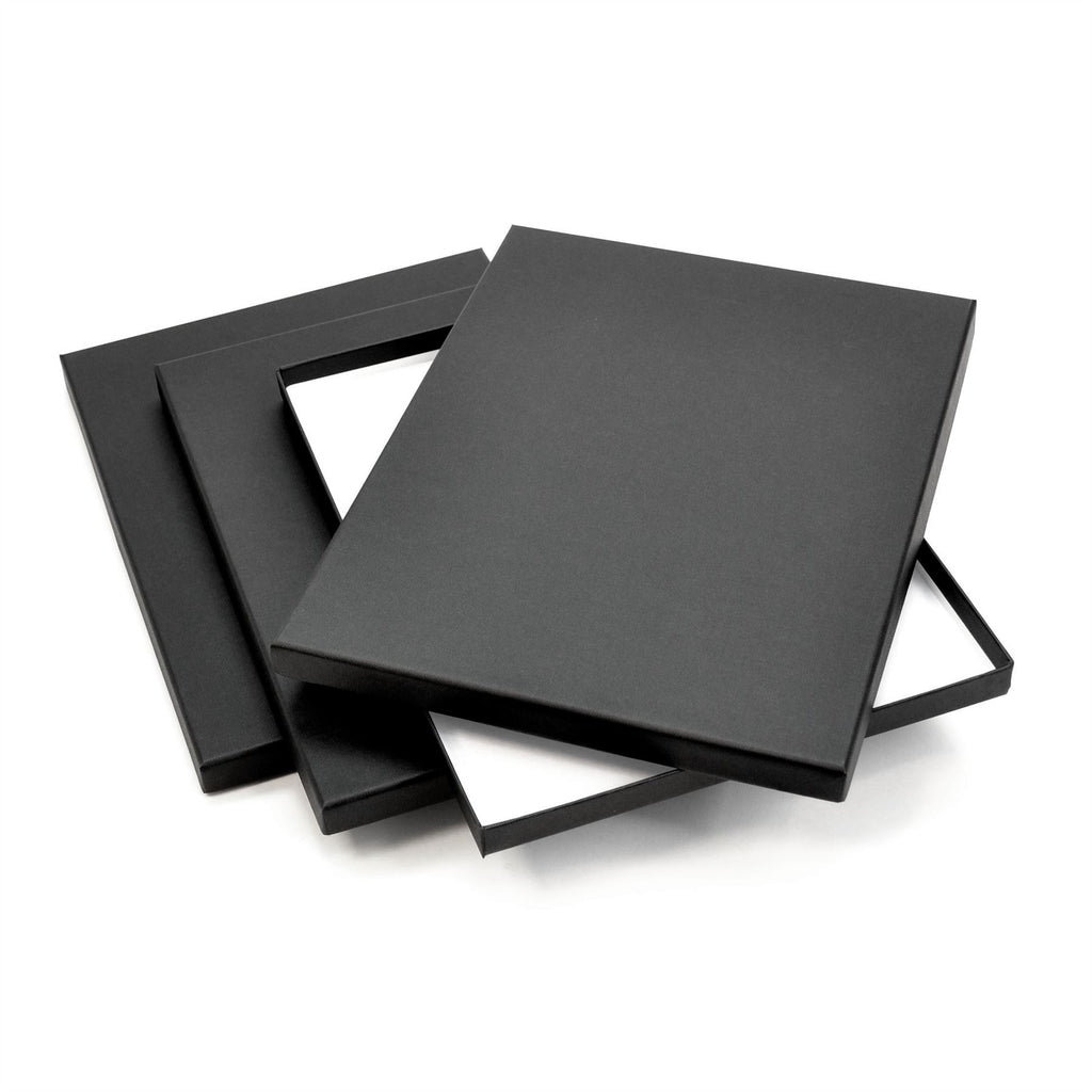 Quality presentation display boxes made in the UK from strong display card with black paper textured finish, archival white lining and simple lift off lid these print boxes are the ideal solution for storage, displaying prints and archiving valuable documents. A modern and stylish alternative to the traditional presentation portfolio