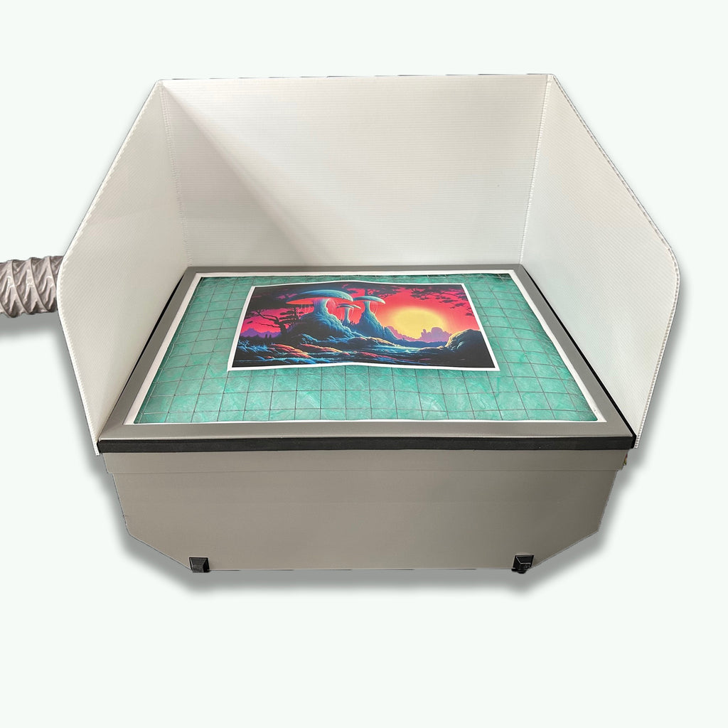 - Horizontal position – Ideal for spraying onto artwork laid onto the filter using spray mount, fixative or lacquers