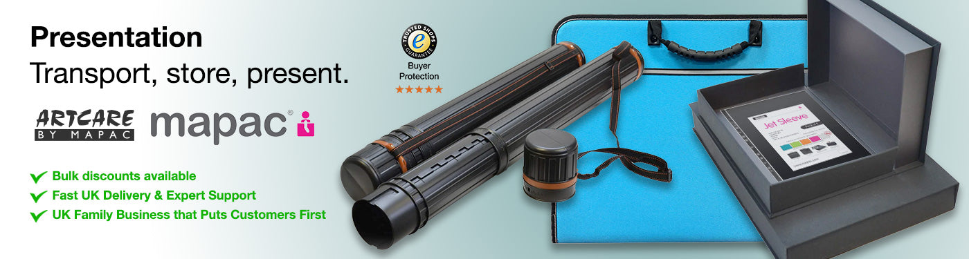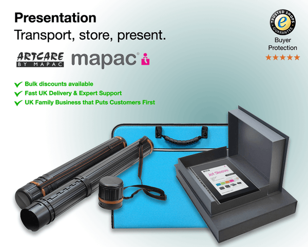 We stock a range of portfolios, presenters, portfolio cases and presentation boxes from many of the leading brands such as Mapac, Artcare and Seawhite of Brighton. From ring-based presentation portfolio's which accommodate sleeves to an everyday portfolio case or presenter, ideal for presenting, storing or transporting your work. We also offer 140 micron presentation sleeves, archival sleeves, budget sleeves, display boxes in 18mm and 50mm depth